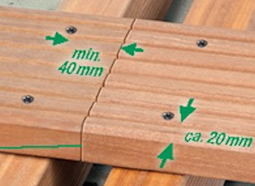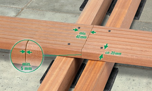 Dublowanie legaru przy długich tarasach Ze względu na odstępy minimalne dwie deski tarasowe nie mogą być mocowane w krawędzi czołowej na jednym legarze. Należy zdublować legar, tzn. jeden legar na każdą krawędź deski. Odstęp czołowy między deskami powinien wynosić 5 mm, aby nie gromadziła się woda.