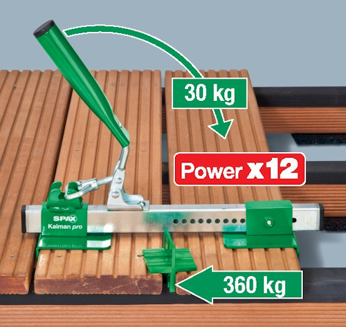 SPAX Dociągarka Kaimann pro - zastosowanie dociągarki wraz z krzyżykami dystansowymi umożliwia prawidłowe usytuowanie nawet odkształconych desek przed ich moco- waniem. Dzięki opatentowanej zasadzie dźwigni dociągarka Kaimann dwunas- tokrotnie wzmacnia siłę nacisku drążka. Oznacza to, że nacisk 30 kg na drążek oddziałuje na krzywiznę deski jak nacisk