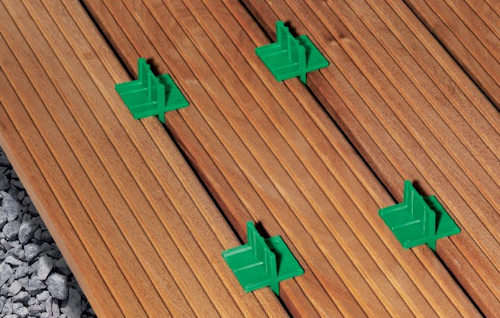 Używając krzyżyków dystansowych SPAX dokładne ustalenie odległości między deskami przestaje być problemem. Przy standardowej szerokości deski 145 mm należy wybrać odstęp 6 mm. Przy wąskich deskach z drewna egzotycznego (szerokość 110 mm) wystarczy zachowanie odstępu 4 mm.