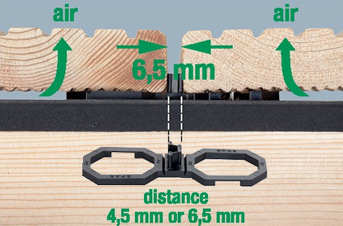 SPAX Air - dystans wentylujący zapobiega osiadaniu wilgoci między legarem a deską tarasową; umożliwia szybki odpływ wilgoci. Woda spływająca na konstrukcję nie ma styczności z deską tarasową. Dzięki dystansom SPAX Air wiatr łatwo osusza wilgoć spomiędzy szczelin tarasu. Zapobiega to występowaniu wilgoci przewlekłej i niszczeniu desek. Dodatkową zaletą jest uzyskiwany dzięki SPAX Air odstęp między deskami- 6,5 mm (dla standardowej grubości desek 14,5 cm) i 4,5 mm (dla wąskich desek z drewna egzotycznego lub drewna z wysokim współczynnikiem wilgoci). Odstęp nie jest stały, lecz może się zmieniać w zależności od warunków. I tak: kiedy drewno pęcznieje na krawędziach stykowych, zmniejsza się odstęp między deskami, a kiedy schnie odstęp ten się zwiększa.