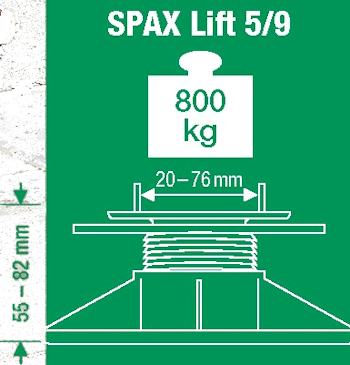 Regulowane wsporniki pod legary SPAX Lift umożliwiają bezpośrednie ułożenie tarasu drewnianego na podłożu betonowym. Dodatkowo zapewniają stabilne osadzenie tarasu z możliwością regulacji jego wysokości. Występują dwa rodzaje wsporników: SPAX Lift 3/5 i SPAX Lift 5/9. Dodatkowo, w sytuacjach tego wymagających, można do SPAX Lift 5/9 zastosować praktyczną przedłużkę (max. 120 mm). Wsporniki można ustawiać również bezpośrednio na ubitym żwirze. Tarasy dachowe stawiane na papie bitumicznej lub papie termozgrzewalnej muszą być stawiane na wspornikach z tworzywa sztucznego.